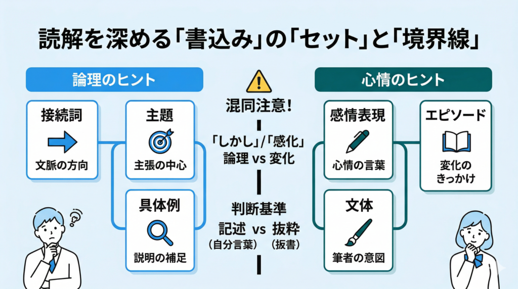 「しかし(逆接)」「つまり(換言)」など、文章の論理が動く場所に印をつけます。これだけで文章の骨組みが見えるようになります。