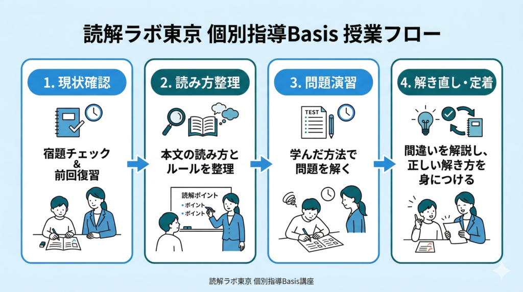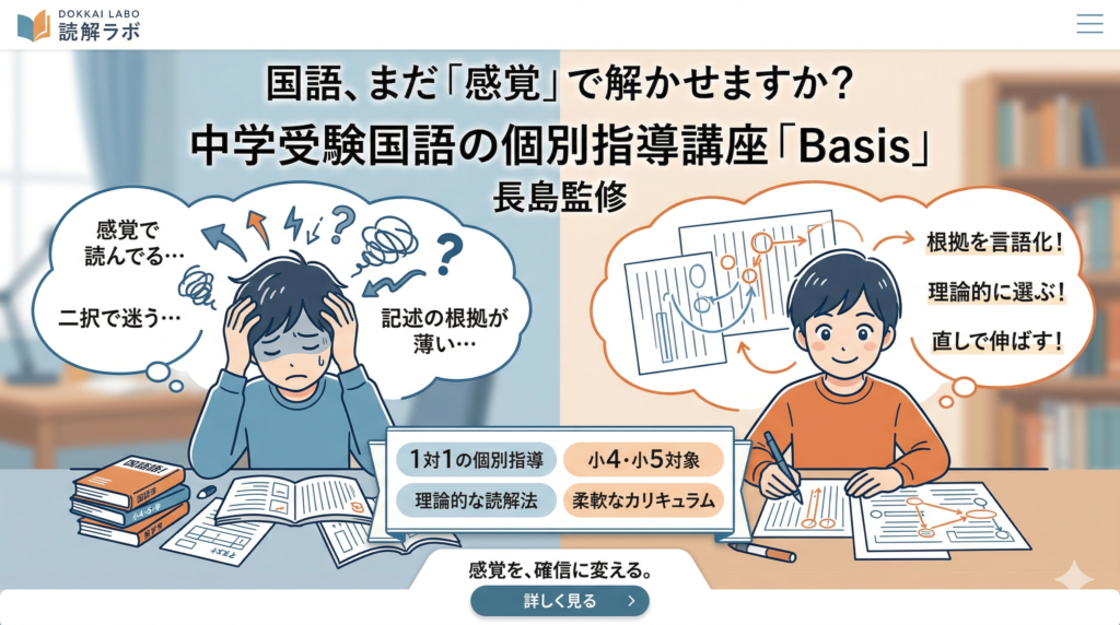 「長島式読解講座『Basis』」は、そうした課題を抱える小学4・5年生を主対象に、読む手順と直し方を1対1でそろえて学ぶ個別指導講座です。講座の並びを先に比べるよりも前に、「今どこで止まっているのか」を整理しながら読み進めていただけるよう、このページでは授業で見るポイントからご案内します。