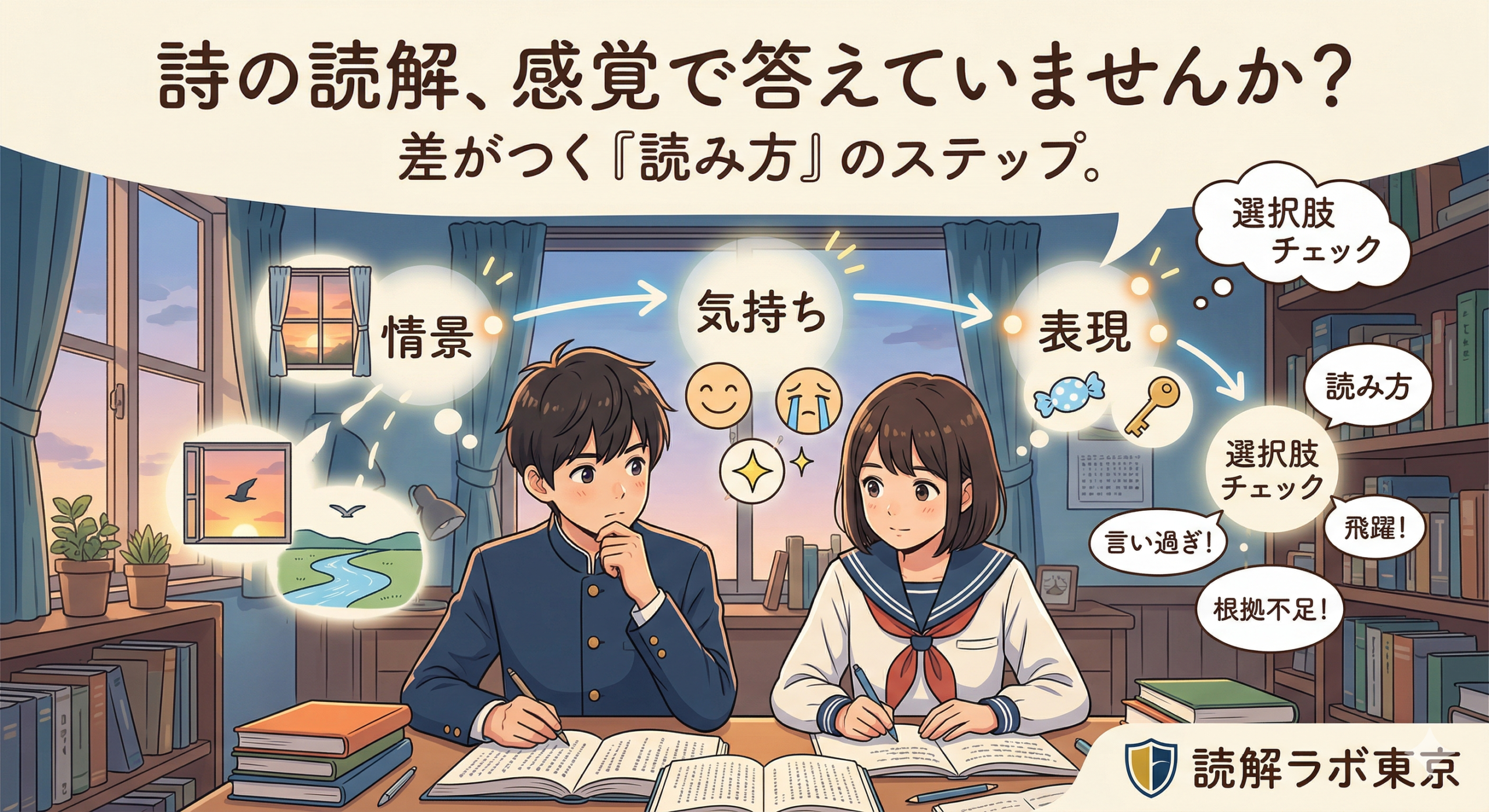 2025年11月9日コラムwpmaster 中学受験の詩の読み方|比喩と象徴を根拠で読み解く対策 中学受験の詩は、短い本文の中で比喩や象徴をどう読み、どの行を根拠に心情へつなげるかで差が出やすい分野です。このページでは、情景→気持ち→表現の順で読む考え方と、選択肢・記述で点に変える読み方を整理します。 点が安定し […]