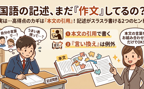 2025年11月8日コラムwpmaster 国語記述の書き方|本文の言葉で書く基本ルール国語の記述問題は、自分の言葉で一から作文するものではありません。基本は、本文中の言葉を使って答えを組み立てることです。ここでは、記述の基本ルールと、本文の言葉をつなぐ書き方のコツを整理します。 実は、記述問題で高得点を狙 […]
