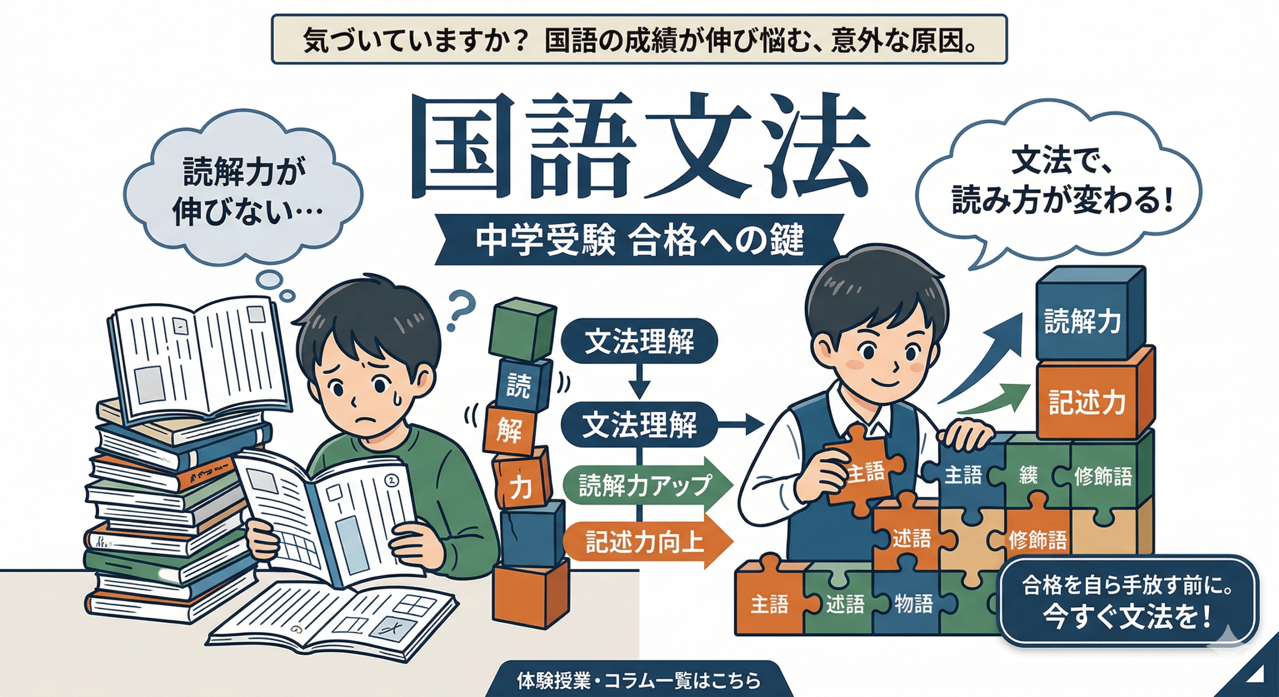 2025年11月9日コラムwpmaster 中学国語の文法事項を一気に整理|品詞・活用・文の成分が分かる基本一覧中学入試に国語文法は必要なのか? 中学入試では文法問題の出題はごくわずかです。そのため、文法の学習が後回しになり、国語の読解力がなかなか伸びないというケースが多く見受けられます。 しかし、『中学受験における国語の偏差値を […]