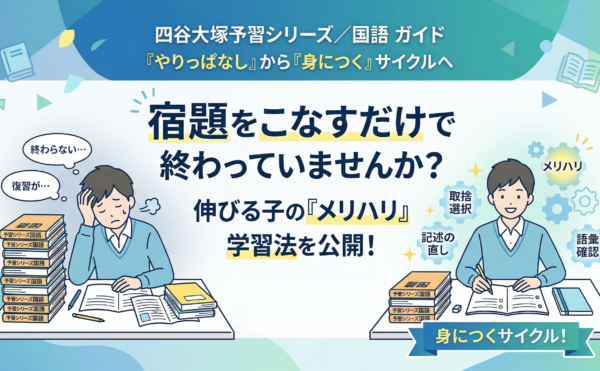 2025年11月26日コラムwpmaster 四谷大塚「予習シリーズ」国語の使い倒し方──宿題を“こなす”から“身につける”へ四谷大塚予習シリーズ/国語 読み時間目安:10〜15分 「予習シリーズの宿題をこなすだけで精一杯」「復習が追いつかない」──そんな悩みを、 「やりっぱなし」から「身につく」サイクルに変えるためのガイドです。 予習シリーズ […]