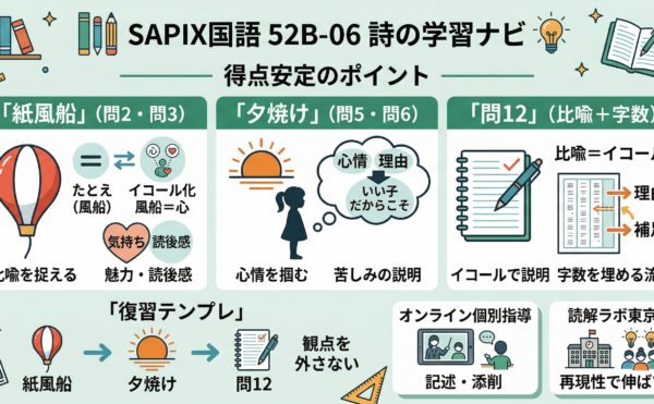 2026年1月14日wpmaster サピックス・小5国語の要点(52B-06)SAPIX国語(小5) 52B-06 SAPIX国語 52B-06 詩+解説文(紙風船 他)|4問のつなげ方と問12の比喩×字数調整 詩は短い分、設問の観点(比喩/読後感/心情)を外すと減点されます。授業の流れを復習に落 […]