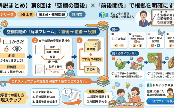 2026年1月29日wpmaster 予習シリーズ小5上巻 第8回の要点解説予習シリーズ 小5 上巻 第8回・発展問題 説明文 【解説まとめ】第8回は「空欄の直後」×「前後関係」で根拠を明確にする 受験国語専門「読解ラボ東京」代表・長島によるライブ解説(小5 上巻 第8回・発展問題)の要点を、 […]