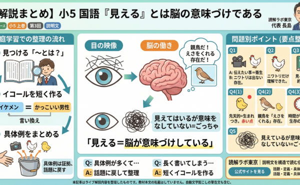 2026年1月28日wpmaster 予習シリーズ小5上巻 第3回の要点解説予習シリーズ 小5 上巻 第3回 説明文 【解説まとめ】「見える」とは何かを言語化する回 受験国語専門「読解ラボ東京」代表・長島によるライブ解説(小5 上巻 第3回)の要点を、 ご家庭で再現できる形に整理しました。 今回 […]