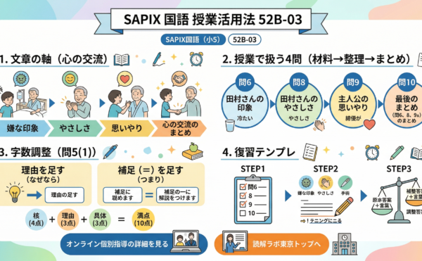 2026年1月14日wpmaster サピックス・小5国語の要点(52B-03)SAPIX国語(小5) 52B-03 SAPIX国語授業の活用法:52B-03「田村さんのはくしゅ」 ──授業で扱う4問の回し方+字数調整(問5(1)) 動画で扱った「授業→復習」の要点を、家庭学習で再現できる形に整理し […]