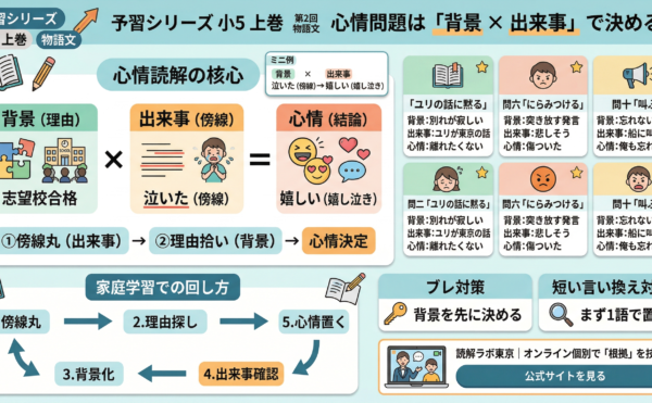 2026年1月28日wpmaster 予習シリーズ小5上巻 第2回の要点解説予習シリーズ 小5 上巻 第2回 物語文 【解説まとめ】心情問題は「背景 × 出来事」で決める 受験国語専門「読解ラボ東京」代表・長島によるライブ解説(小5 上巻 第2回)の要点を、 ご家庭で再現できる形に整理しました。 […]