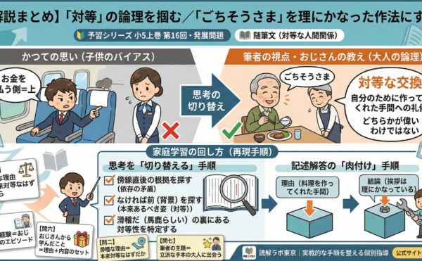 2026年1月28日wpmaster 予習シリーズ小5上巻 第4回の要点解説予習シリーズ 小5 上巻 第4回・発展問題 説明文 【解説まとめ】説明問題は「イコール」を作る 受験国語専門「読解ラボ東京」代表・長島によるライブ解説(第4回・発展問題)の要点を、 ご家庭で再現できる形に整理しました。キ […]
