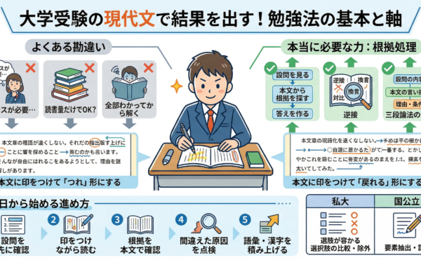 2026年3月13日コラムwpmaster 大学受験の現代文で結果を出すために見直したい勉強法の基本と軸大学受験の現代文で結果を出すために見直したい勉強法の基本と軸 現代文は、何となく読めたかどうかで点数が決まる科目ではありません。大学受験で問われているのは、本文を完璧に味わい尽くすことではなく、設問に対して本文中の根拠を […]