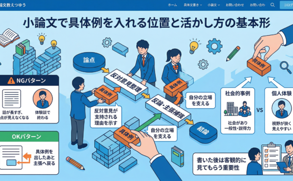 2026年3月13日wpmaster 小論文で具体例を入れる位置と活かし方を整理する考え方の基本形大学受験・小論文対策 小論文で具体例を入れる位置と活かし方を整理する考え方の基本形 小論文で自分の意見はあるのに、具体例をどう入れればよいのか分からず手が止まる受験生は少なくありません。ですが、具体例は思いついたものをそ […]