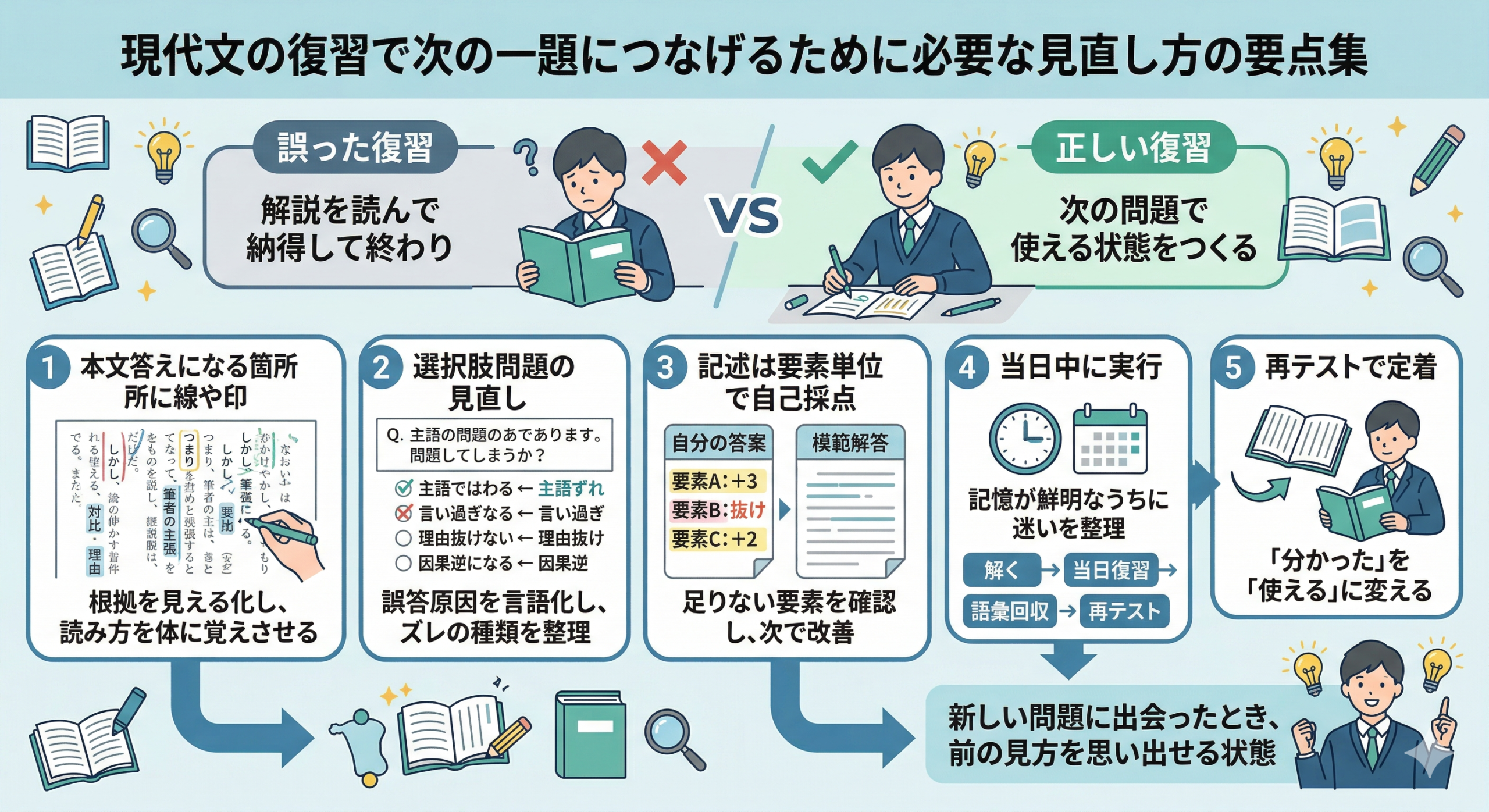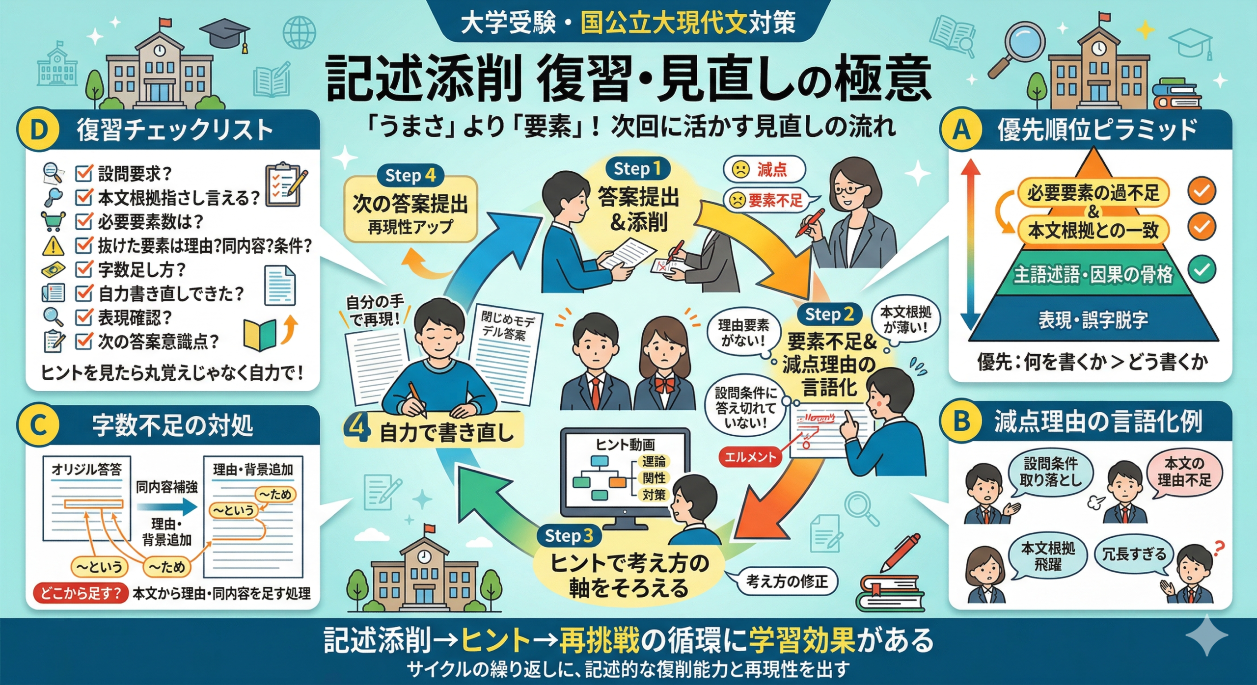2026年3月13日wpmaster 記述添削を受けた後に答案で見直すべき点を整理するための考え方大学受験・国公立大現代文対策 記述添削を受けた後に答案で見直すべき点を整理するための考え方 国公立大現代文の添削を受けたあと、赤字やコメントを見て「なるほど」と思ったのに、次の答案ではまた同じ減点を受けてしまう。こうした […]