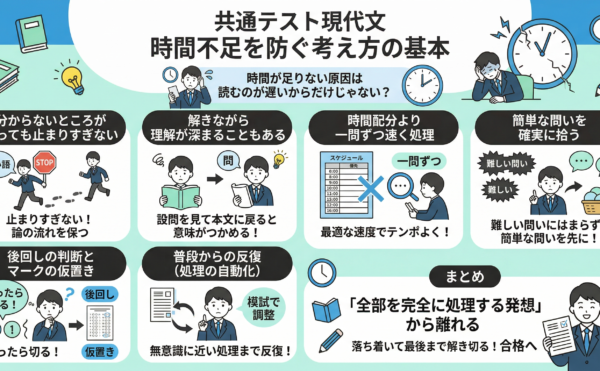 2026年3月13日wpmaster 共通テスト現代文で時間不足を防ぐために見直したい考え方の基本大学受験・共通テスト国語対策 共通テスト現代文で時間不足を防ぐために見直したい考え方の基本 共通テスト国語の現代文で、いつも最後まで落ち着いて解き切れない。本文を読んでいるうちに時間がなくなり、後半は焦って選び、見直しも […]