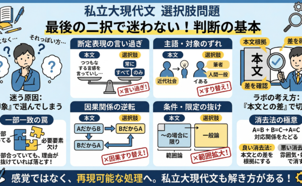 2026年3月13日コラムwpmaster 私立大現代文の選択肢問題で迷いを減らすために必要な考え方基本大学受験・私立大現代文対策 私立大現代文の選択肢問題で判断しやすくするために必要な考え方基本 私立大現代文で点数が安定しない生徒さんの多くは、本文がまったく読めていないというより、選択肢を最後にどう切るかで判断に迷ってい […]