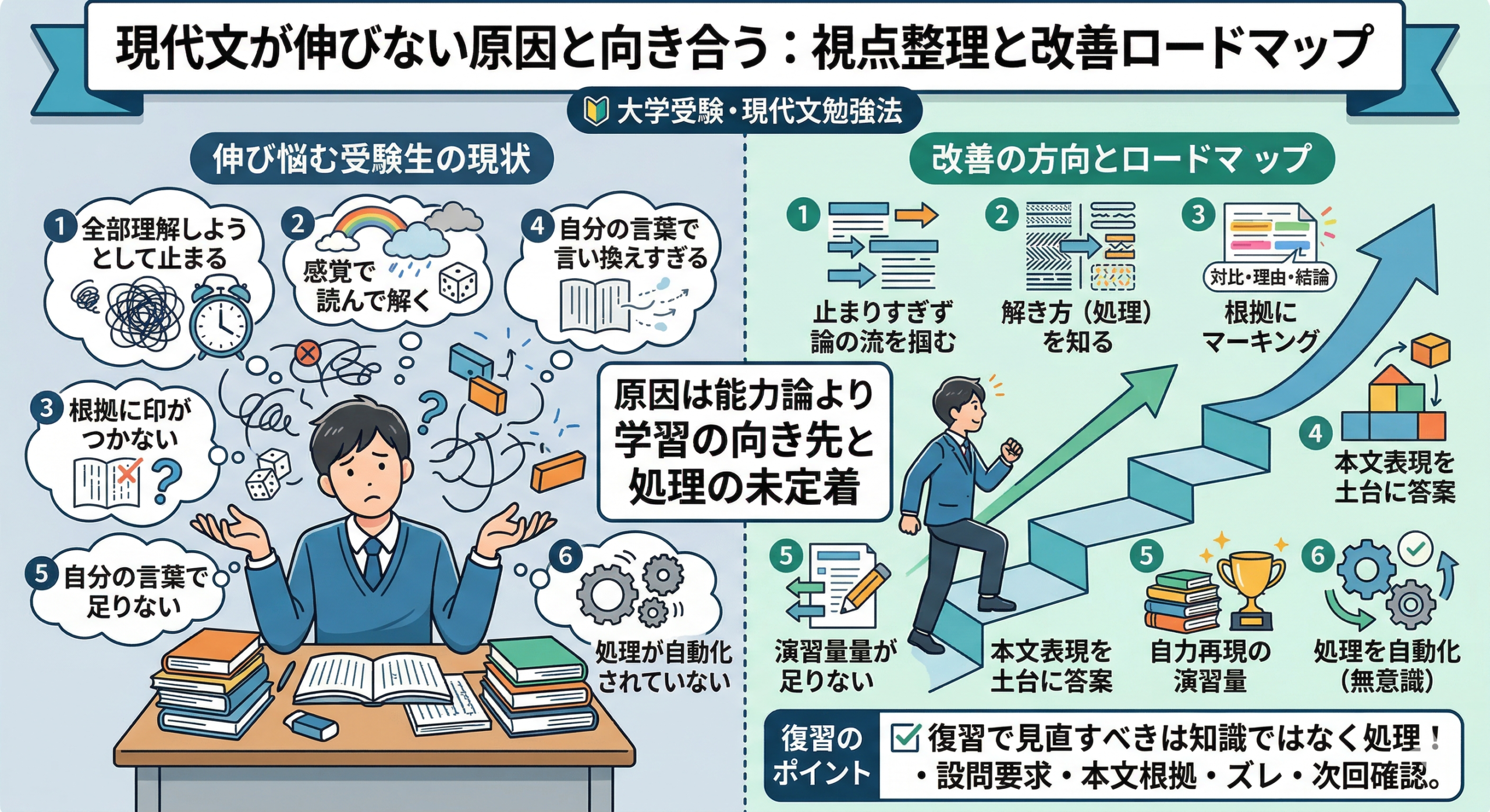 2026年3月13日コラムwpmaster 現代文が伸びない受験生に共通する原因と向き合うための視点整理大学受験・現代文勉強法 現代文が伸びない受験生に共通する原因と向き合うための視点整理 現代文を勉強しているのに点が上がらないとき、多くの受験生は「自分には読解力がないのではないか」と考えがちです。ですが、現代文が伸びない […]