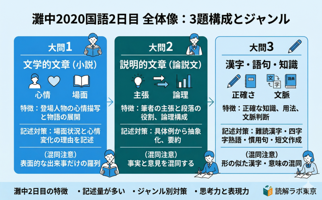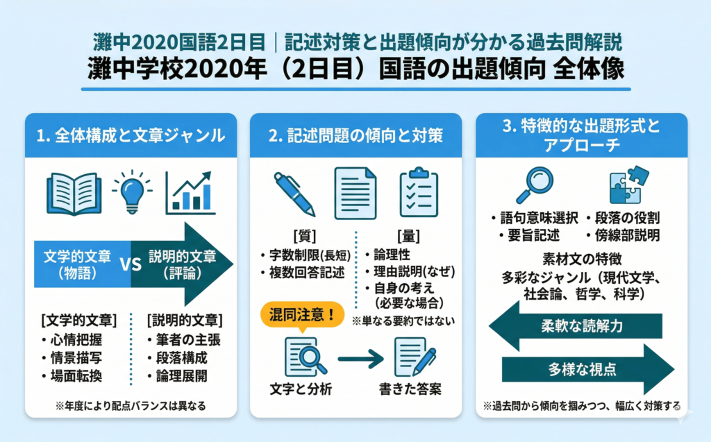 灘中学校2020年(令和2年度)入試〈2日目〉国語を、出題傾向→厳選設問の解き方→得点の取り方の順で整理します。