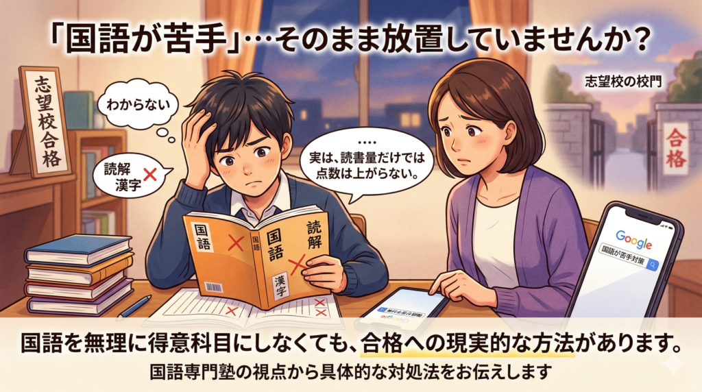 本ページでは、国語専門塾としての視点から、「国語を無理に得意科目にしようとしない」という現実的な戦略と、日々の学習でできる具体的な対処法を整理してお伝えします。