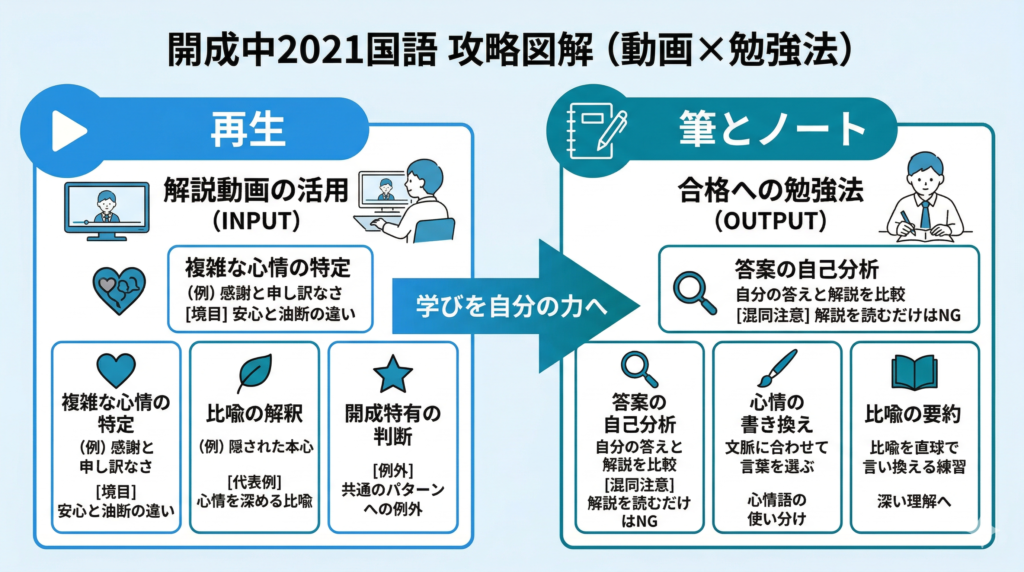 開成中2021(令和3)国語の厳選設問は、難しく見えても「本文のどこが根拠か」を押さえると解き筋が立ちます。このページでは、とくに再現性が高い次の2つの解法に絞って整理します(開成志望者はもちろん、難関中の記述対策にも活用できます)。