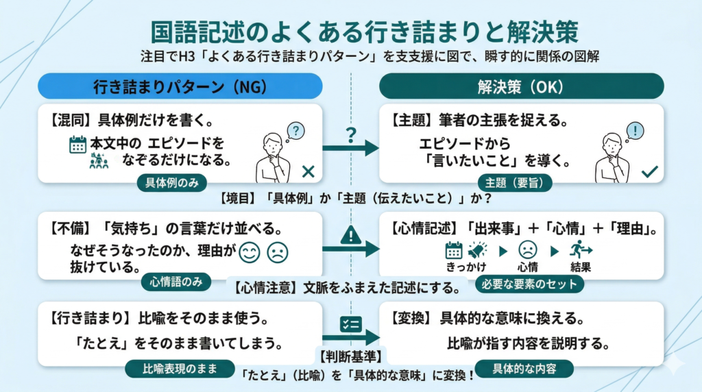 | 要素欠け | 「気持ちだけ」「理由だけ」で終わる | 問いのパターンに合わせて要素を2つに分けて書く |