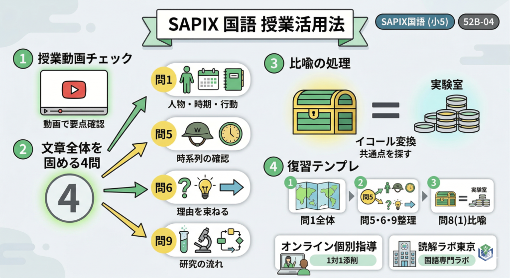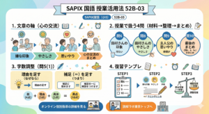 SAPIX国語の授業内容を「分かった」で終わらせず、本文の整理・理由説明・比喩処理まで、答案として安定させます。
