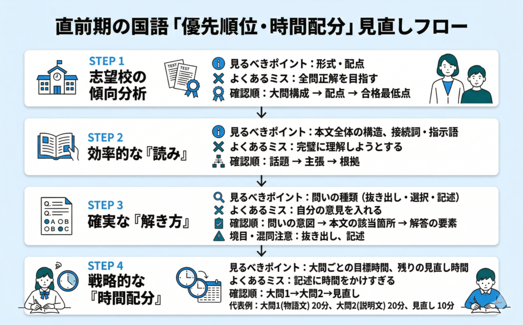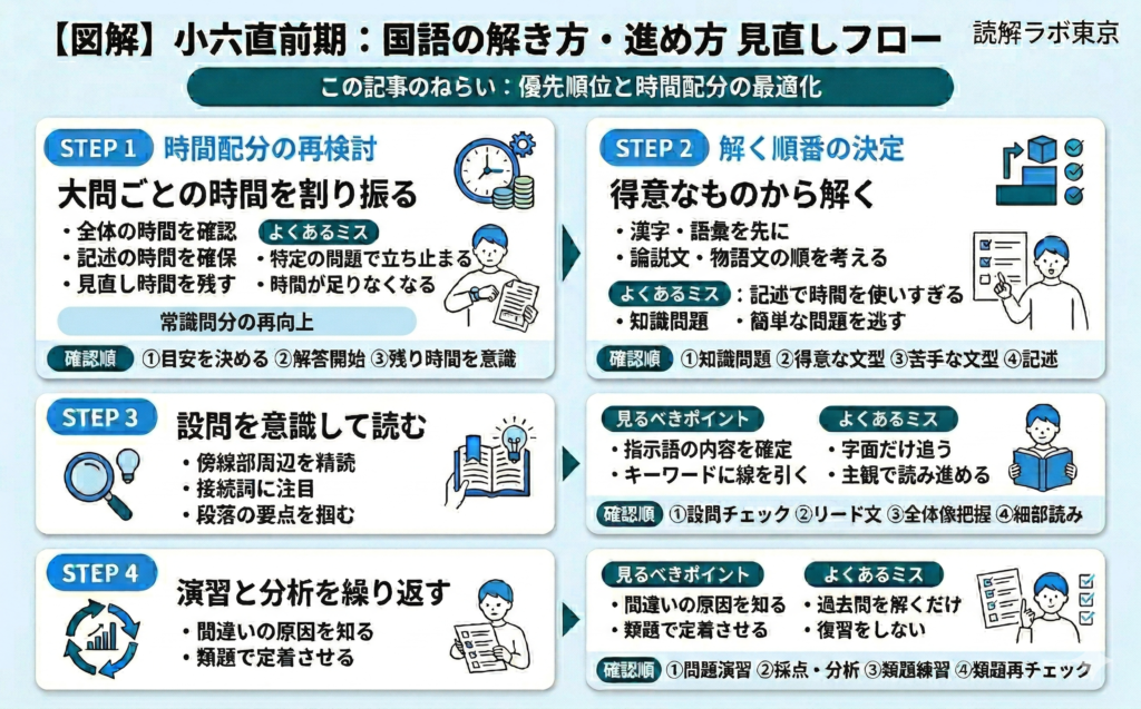 国語テスト本番の「集中できない」「時間が足りない」対策の全体像はこちら:全体像はこちら