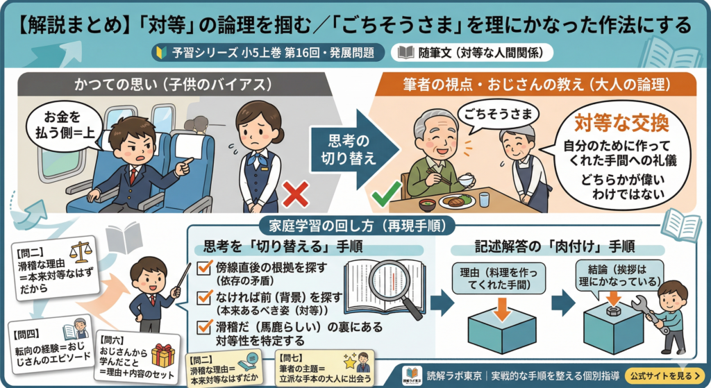 「挨拶は理にかなっている」という答えだけでなく、その「理由(料理を作ってくれた手間)」をセットで書く習慣を。記述の字数指定に合わせて情報を出し入れする技術を鍛えます。