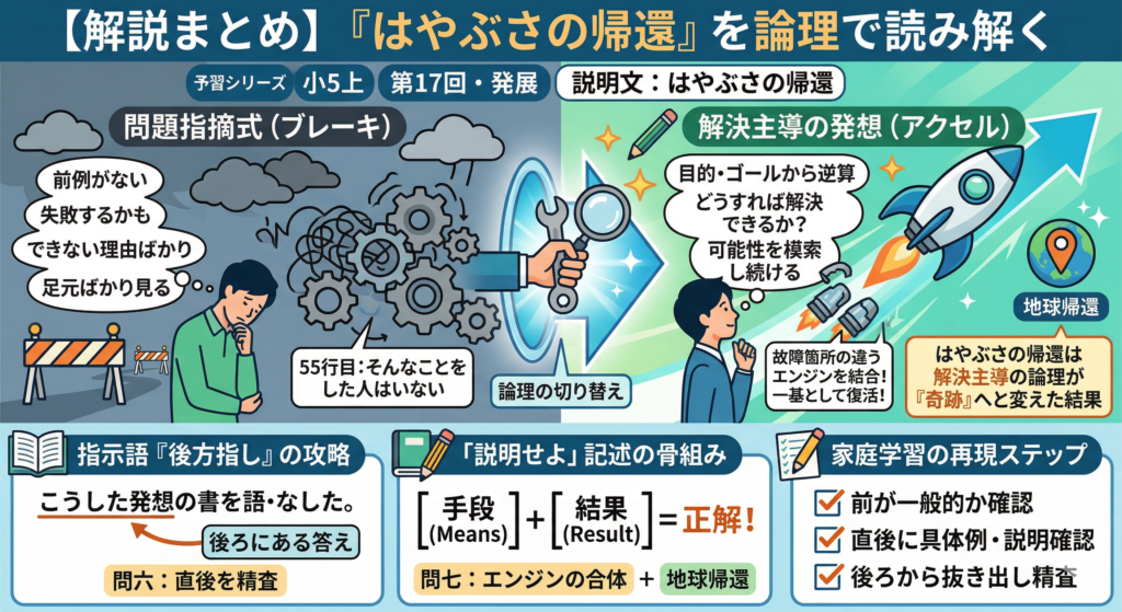 「はやぶさ」のような壮大なテーマも、指示語の例外処理と手段・結果のセットという技術で攻略可能です。