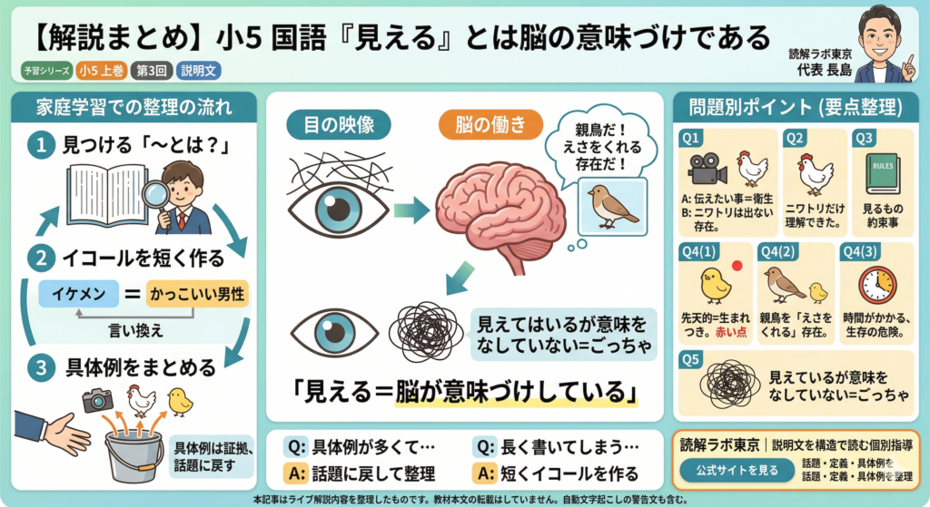 受験国語専門「読解ラボ東京」代表・長島によるライブ解説(小5 上巻 第3回)の要点を、