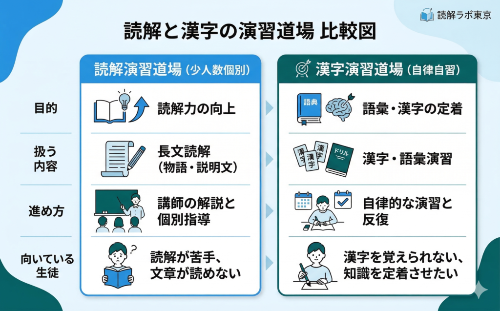 - 同じ枠組みの中で、読解と漢字の演習をそれぞれ行います。時間割では【読解】【漢字】の表記をご確認ください。