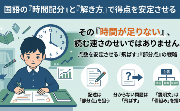 2020年6月20日コラムwpmaster 文章理解に時間がかかる対策|国語を時間内に解く進め方の基本編文章理解に時間がかかる対策|国語を時間内に解く進め方の基本編 文章を理解するのに時間がかかる子は、読解力そのものより、途中で止まりすぎたり二度読みが増えたりしていることが少なくありません。このページでは、中学受験国語の長 […]