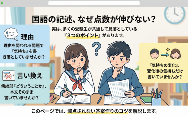 2022年5月20日コラムwpmaster 中学受験国語「理由を答える問題」記述でよくある3つのミスと直し方中学受験の国語で「記述問題がなかなか伸びない」「減点される理由が分からない」と感じている受験生は少なくありません。実は、記述問題では多くの生徒が共通して3つのポイントを見落としていることがあります。 このページでは、物語 […]