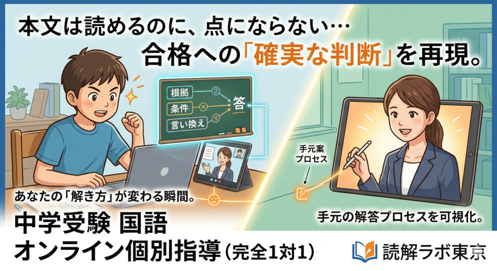 オンライン個別指導を含む開講講座の全体像(受講形式・他講座との組み合わせ・選び方)は、開講講座のご案内(全体像はこちら)でご確認いただけます。オンラインでも本当に伸びるのか、教室に通わずに成立するのかという判断軸は、中学受験 国語オンライン|単独で成立する条件と判断軸で整理しています。指導の具体像(なぜ選ばれるか・何をどう直すか)は、読解ラボ東京のオンライン個別指導が選ばれる理由でも紹介しています。