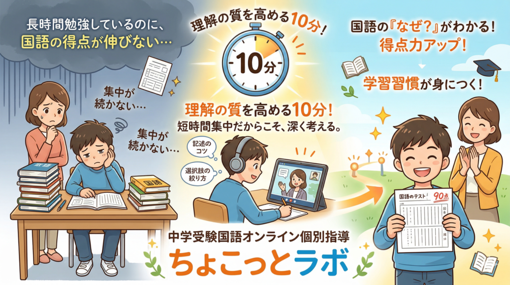 中学受験の国語で、長時間勉強しているのに得点につながりにくい、集中が続かないと感じるご家庭向けに、10分で深く考えるオンライン個別指導「ちょこっとラボ」をご用意しています。