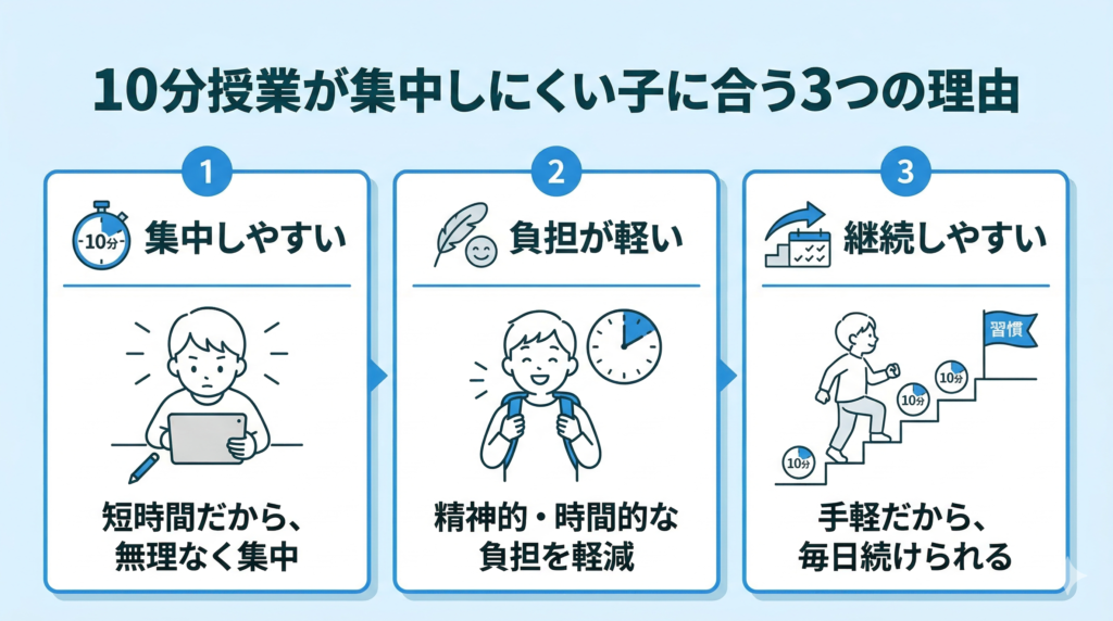 短い授業だからこそ、取りかかりやすく、疲れ切る前に学習を終えられます。学習習慣をつけたいご家庭にも相性のよい形式です。