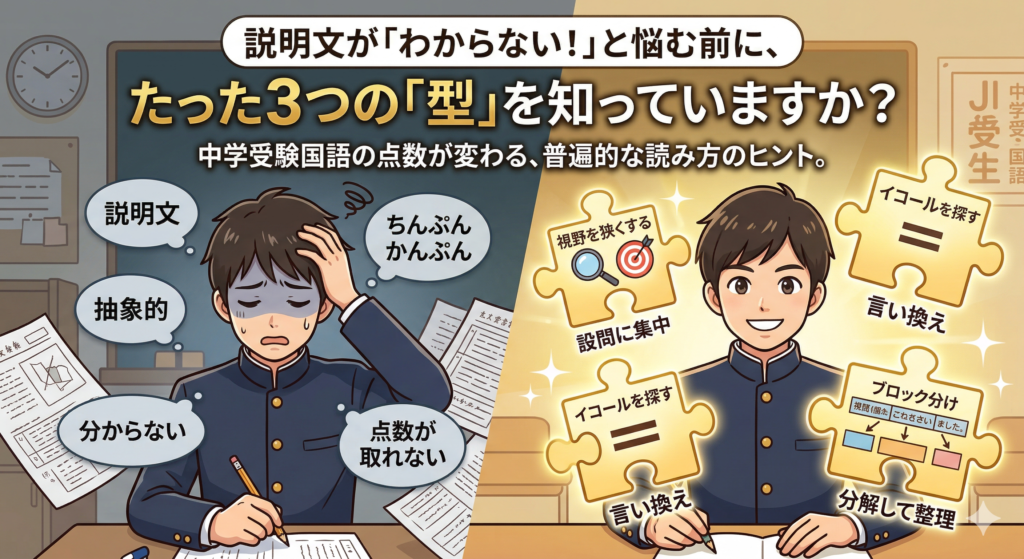 「説明文の設問にもいろいろな種類がありますが、まずは代表的な解き方を三つ押さえておくだけで、記述問題に対する精度が一気に上がります。」